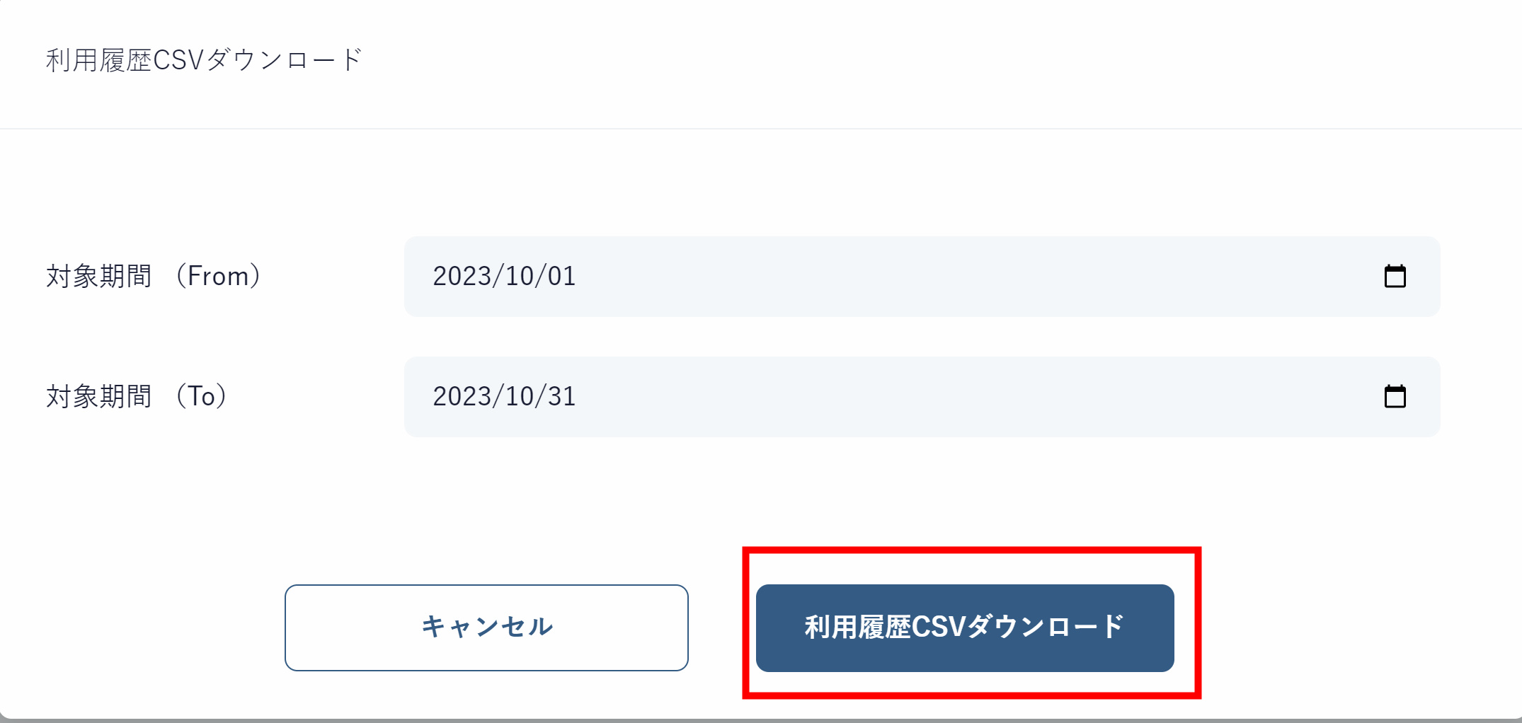 - 「利用履歴CSVダウンロード」利用履歴CSVダウンロード画面が表示されます。対象期間(From/To) を設定し、「利用履歴CSVダウンロード」をクリックします。ダウンロードができます。