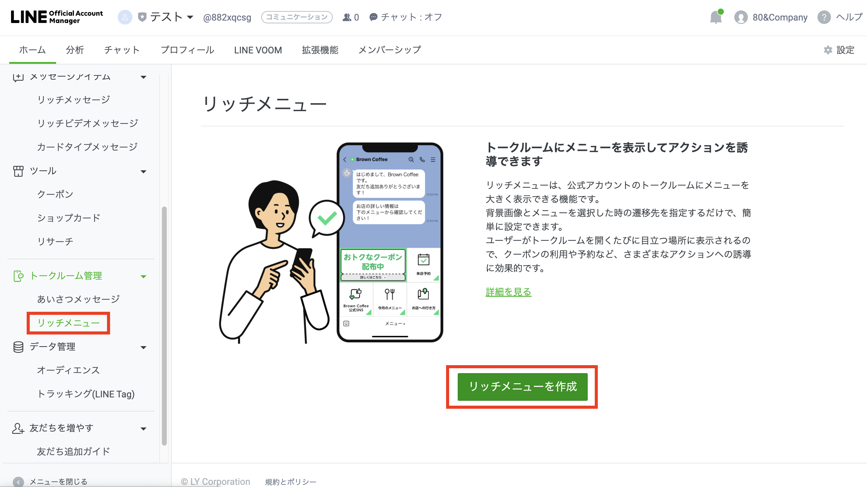 左メニュー「リッチメニュー」より「リッチメニューを作成」をクリックします。