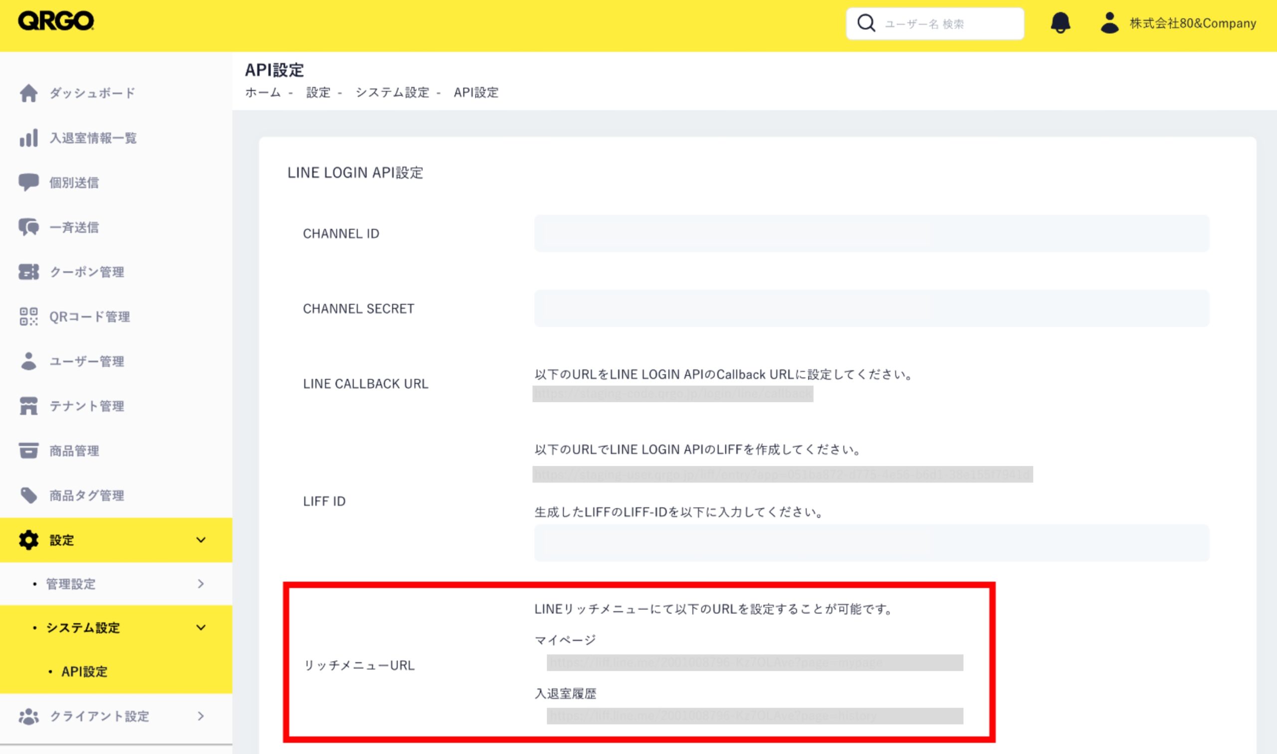 QRGO管理画面「API設定」ページの「リッチメニューURL」に表示される項目は、必ずリッチメニューのコンテンツに含めます。